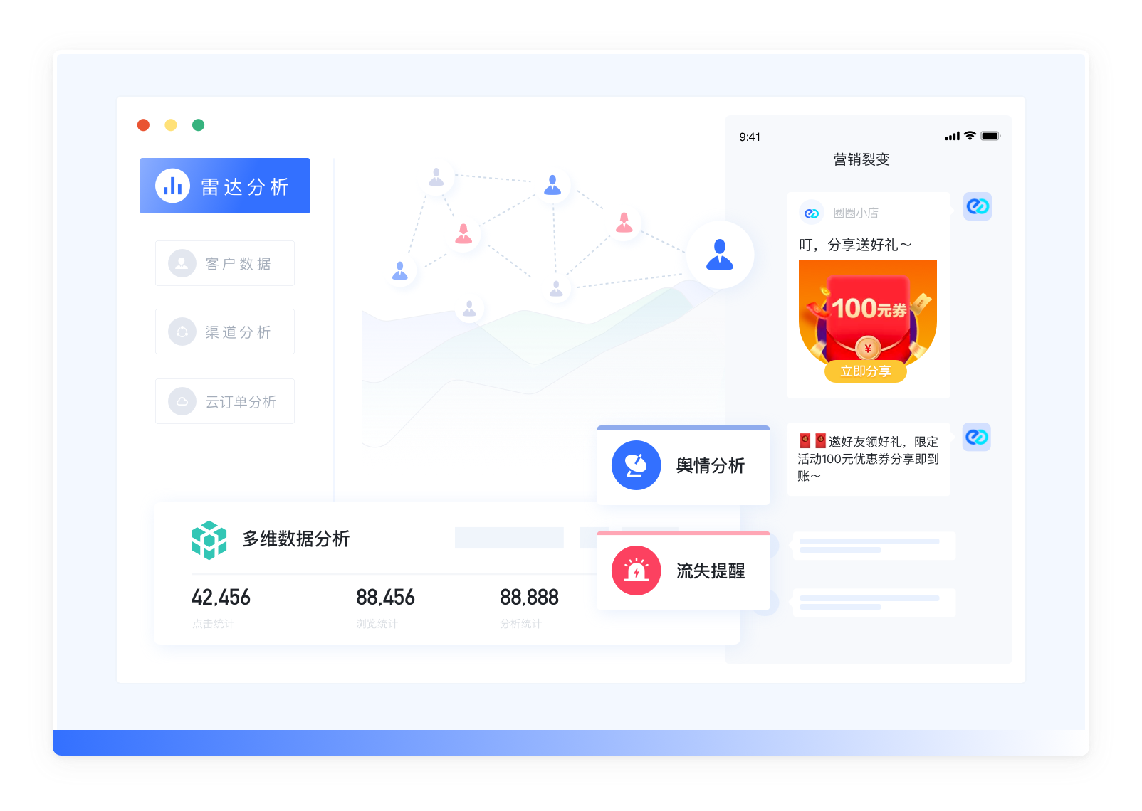 全链路触点跟踪,洞察用户喜好,识别关键成交节点,绘制可视化数据看板,赋能经营者高效分析决策